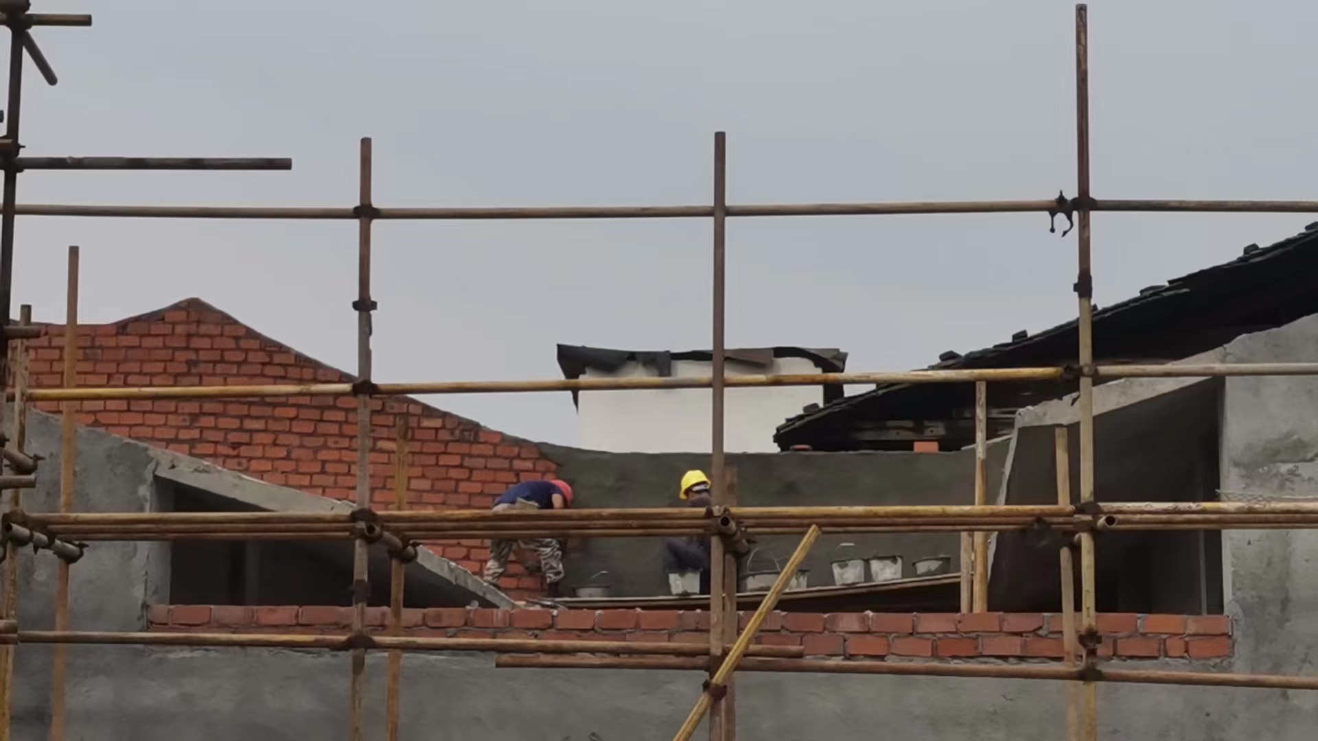 进行内外墙粉刷、内外墙底漆喷涂、雨污水管铺设、吊顶龙骨安装、停车场植草砖铺贴。