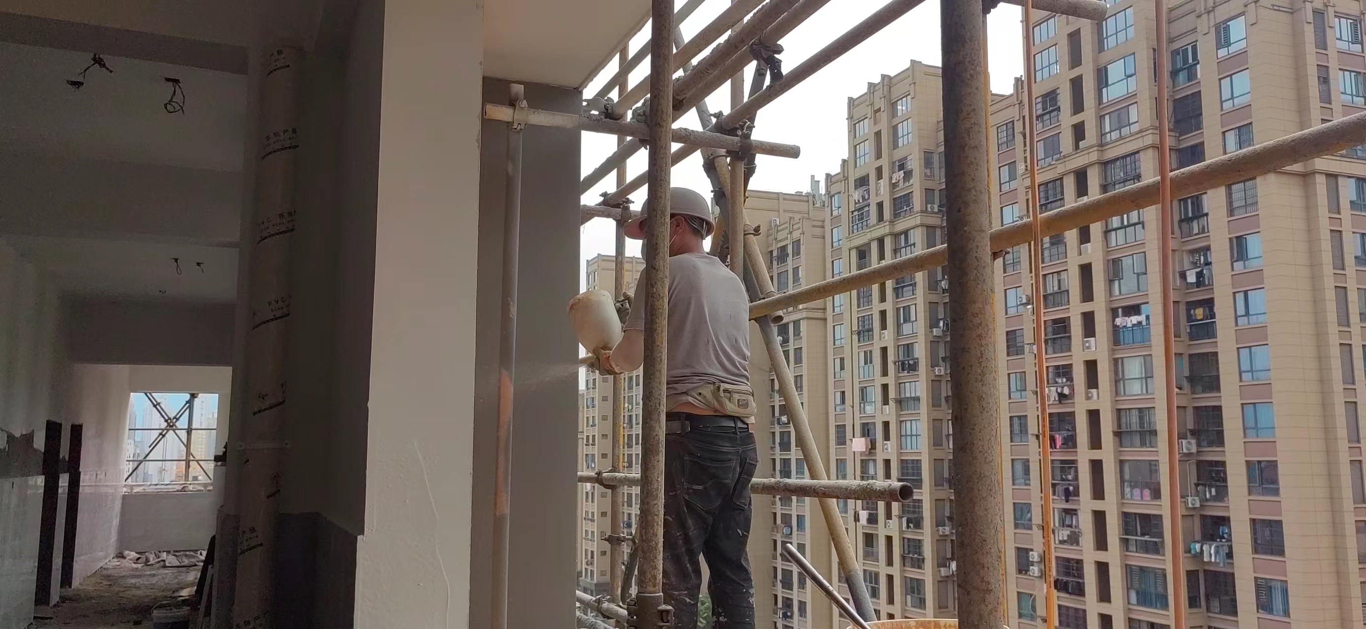 完成八至十层阳台墙面瓷砖铺贴、天棚刮腻子。
