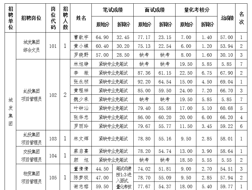 根据《沙县区区属国有企业关于2022年下半年公开招聘工作人员公告》,现将本次招聘总成绩情况通告如下: