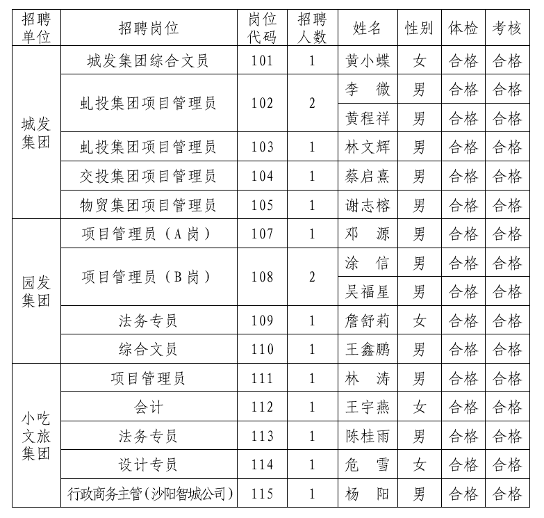 沙县区区属国有企业关于2022年下半年公开招聘工作人员拟聘用人选名单
